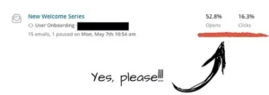 The existing autoresponder was generating a 30.1% open rate and a 2.4% click rate – not bad, but also not great. After implementing the new email marketing autoresponder / automation, open rates improved to 52.8% (up +75.4%) and click rates improved 16.3% (up +579.2%)!