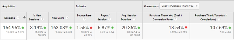 Over the next 12 months, direct and organic sessions improved by 73.0% (30,532 vs 17,648). Organic search traffic alone improved by 155.0% (17,520 vs 6,872). In addition, direct and organic purchases rose 32.3% (328 vs 248) at the same time with most of the improvement in purchases coming from organic search – up 107.7% (108 vs. 52).