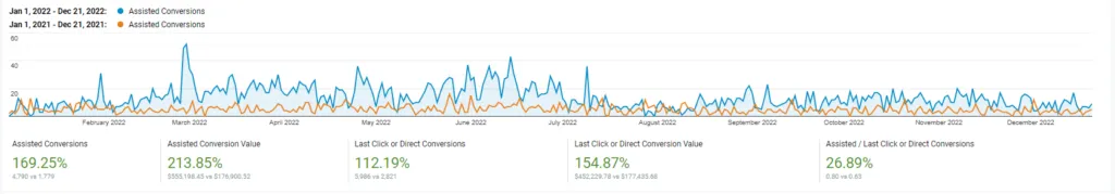 In 2022, the non-profit saw a total of $555K in assisted conversions and $452K in last click or direct conversion value from paid search campaigns. Assisted conversion value was up 214% from the previous year and the last click conversion value was up 155% compared to 2021. The 2022 total was $1,007,427 in assisted and direct value per Google Analytics.